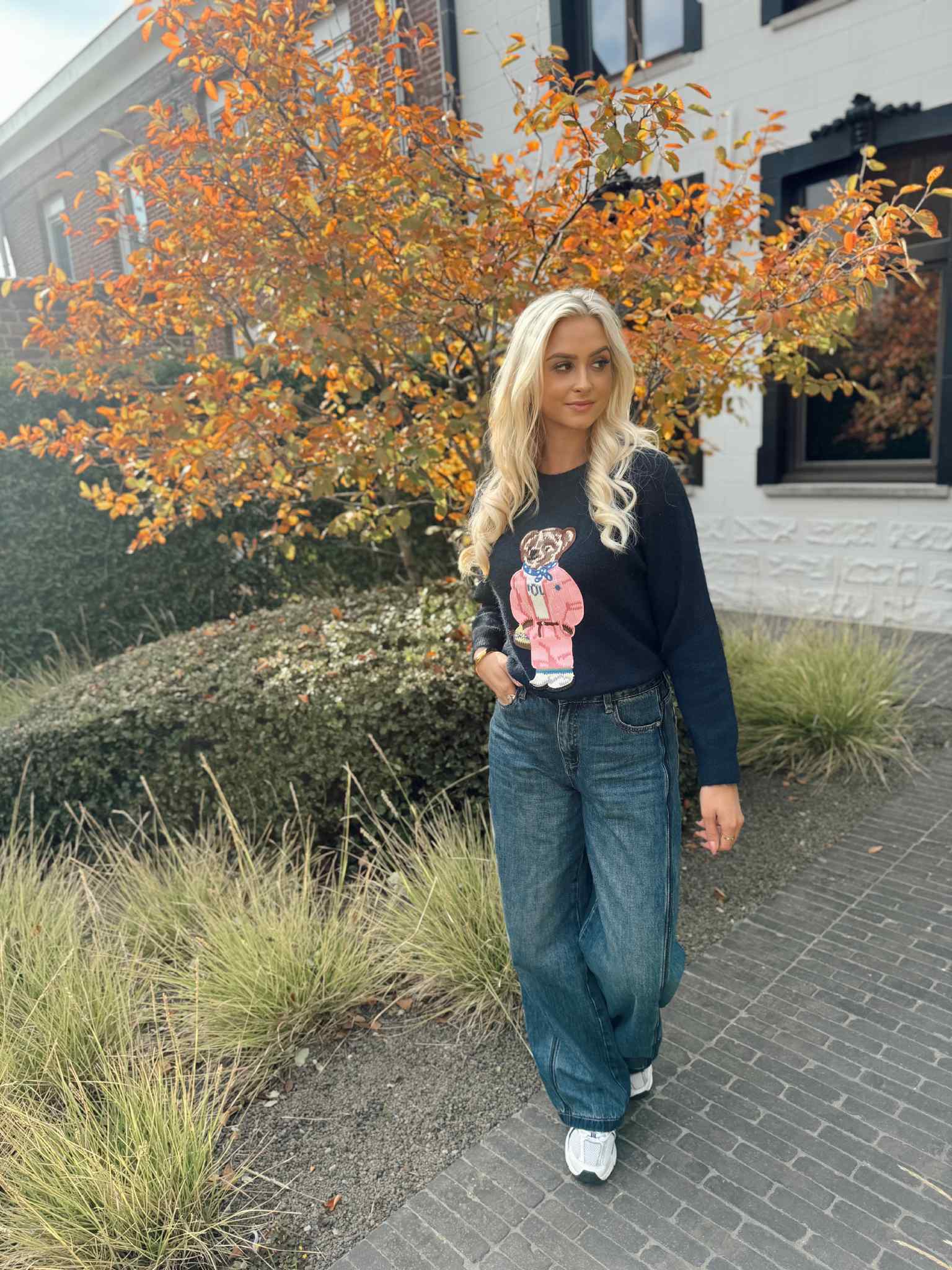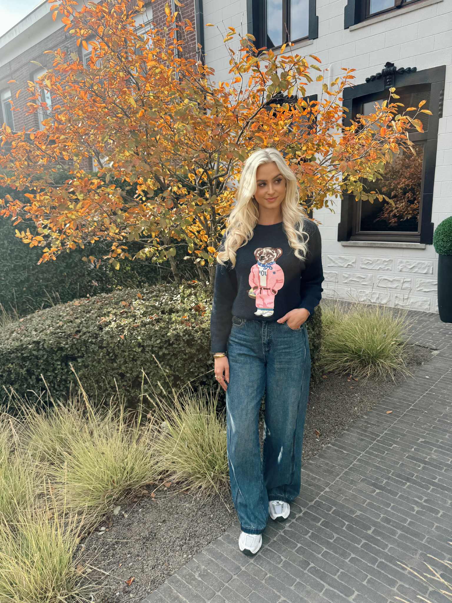 – Ronde hals. – Prikt niet. – Met beer er op.